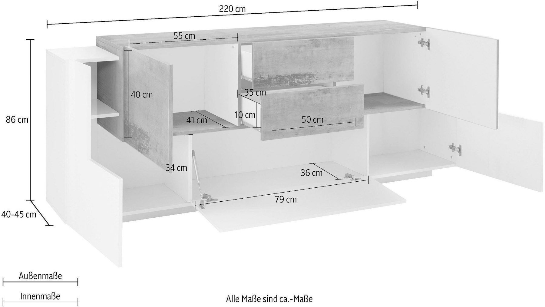 Lukas 3A/2A/2C WM è una credenza di design moderno dalle dimensioni generose (220 cm di larghezza), ideale per arredare con eleganza e funzionalità la zona living o la cucina. Realizzata in legno MDF di alta qualità, presenta una raffinata finitura bicolore bianco laccato lucido / acero pereira, che crea un contrasto armonioso e naturale.