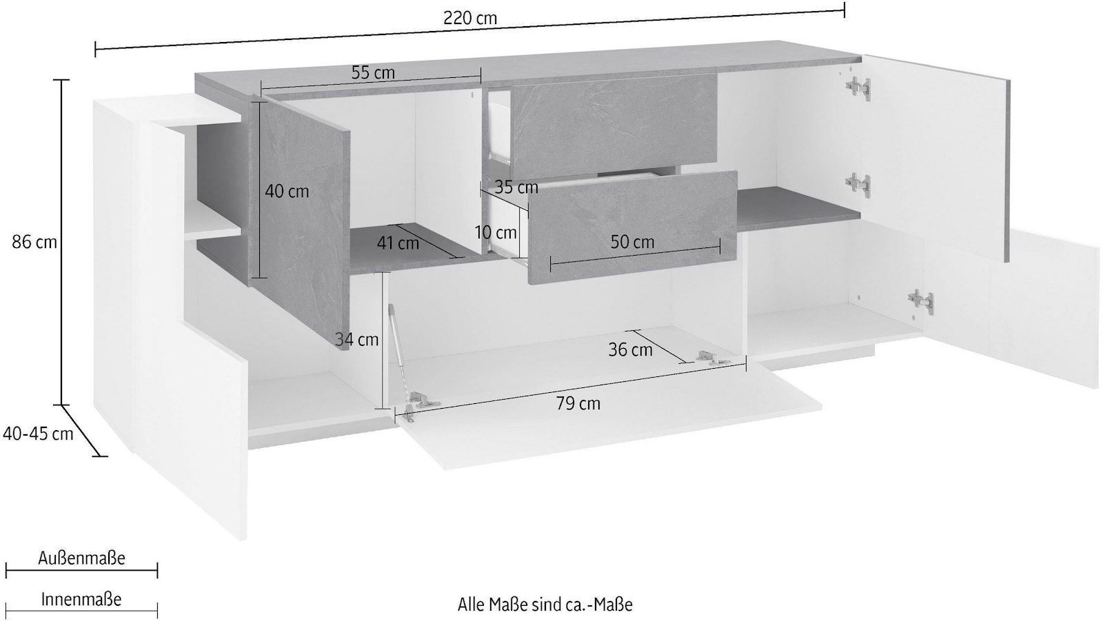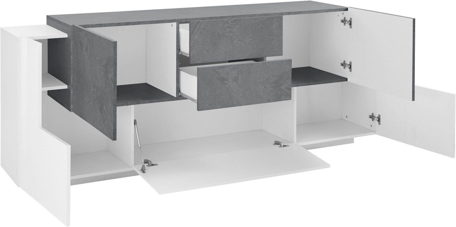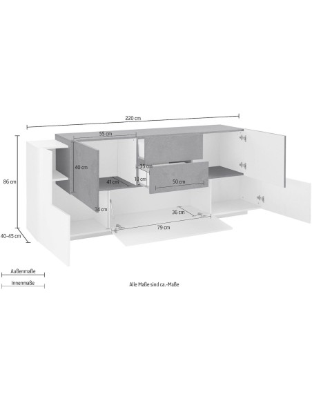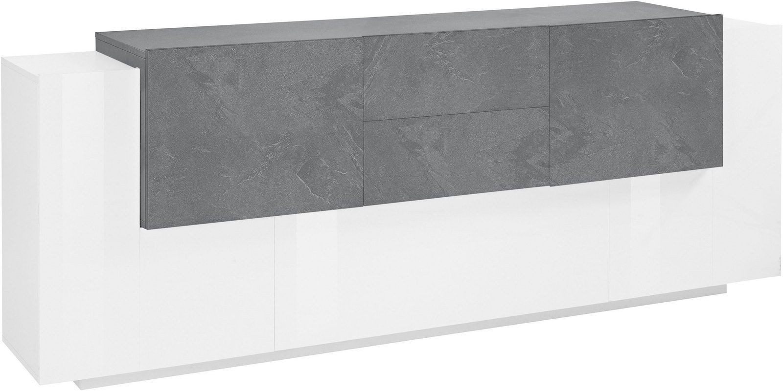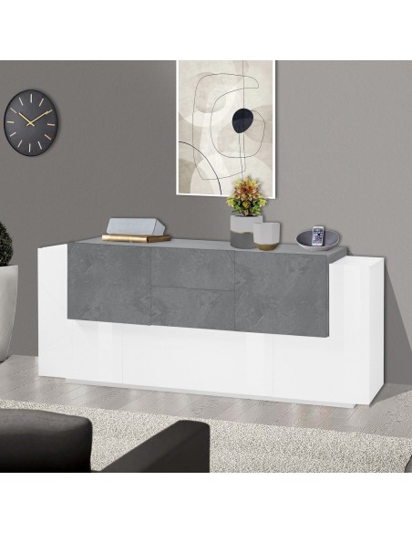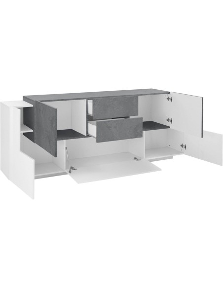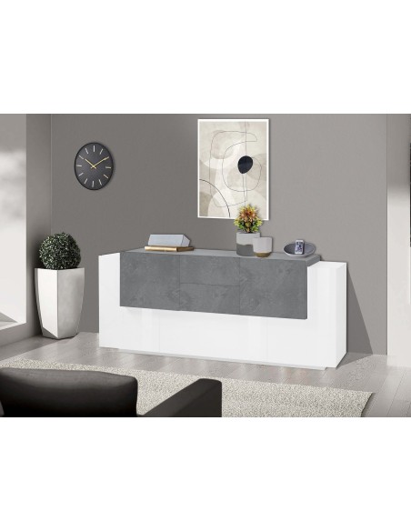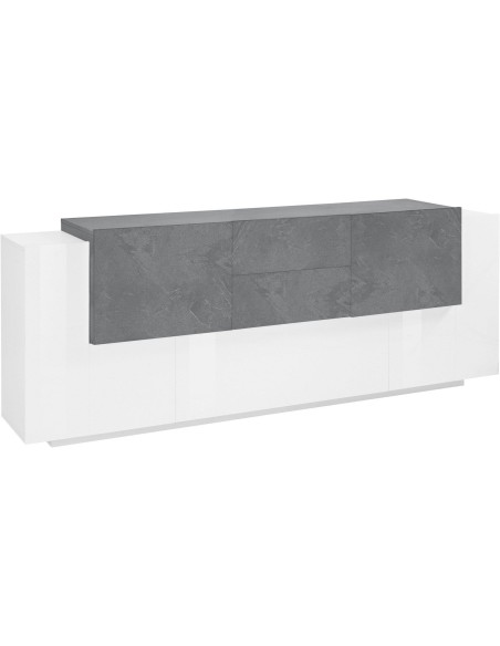 Lukas 3A/2A/2C WS è una madia moderna di design dalle dimensioni generose (220 cm di larghezza), pensata per arredare con eleganza la zona living o la cucina. Realizzata in legno MDF di alta qualità, si distingue per la sua finitura bicolore bianco laccato lucido / ardesia, che combina luminosità e raffinatezza in un equilibrio perfetto tra moderno e materico.