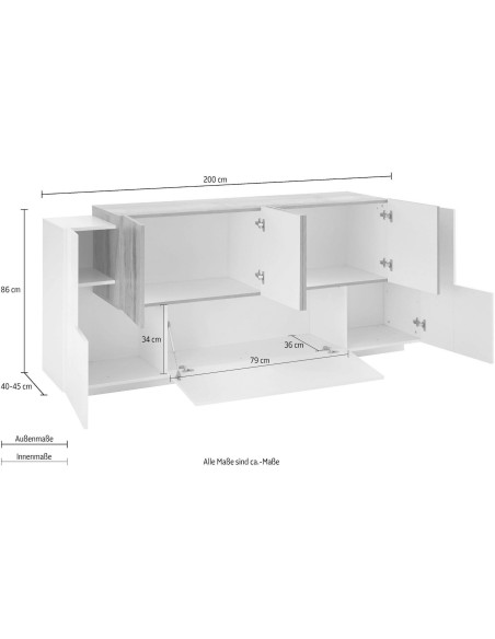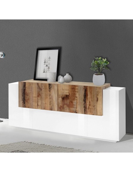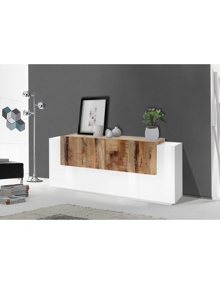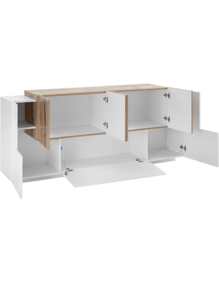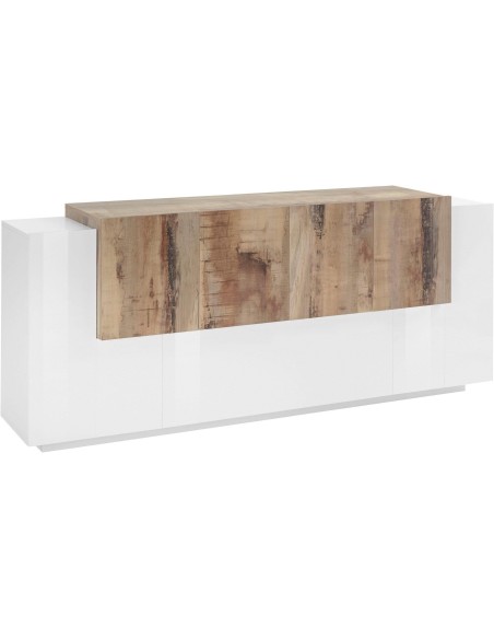 Lukas 3A/4A WM è una credenza moderna da cucina dal design elegante e contemporaneo, ideale per arredare con stile anche gli ambienti più spaziosi. Realizzata in legno MDF di alta qualità, si distingue per la raffinata finitura bicolore bianco laccato lucido / acero pereira, che unisce luminosità e calore naturale in un perfetto equilibrio estetico.