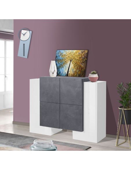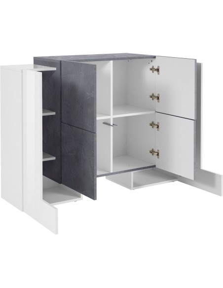 La madia alta Kevin H2A/4A WR è un complemento d’arredo dal design elegante e moderno, perfetto per chi desidera unire funzionalità e stile contemporaneo. Realizzata in pannelli di legno MDF resistenti, presenta una finitura bicolore bianco lucido / report, che abbina la brillantezza del bianco alla calda matericità del legno effetto rovere, donando armonia e luminosità all’ambiente.