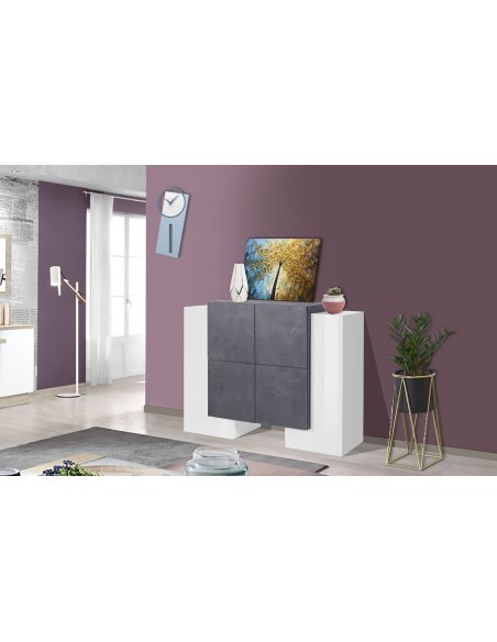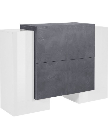 Kevin H2A/4A WR è una madia alta moderna dal design essenziale e raffinato, ideale per arredare con gusto la zona living, la cucina o la camera da letto. Realizzata in legno MDF di alta qualità, si distingue per la sua finitura bicolore bianco laccato lucido / report, che unisce la luminosità del bianco alla texture naturale effetto legno, creando un contrasto elegante e contemporaneo.