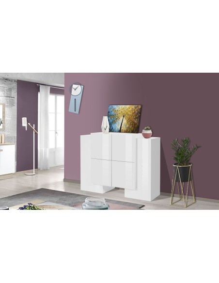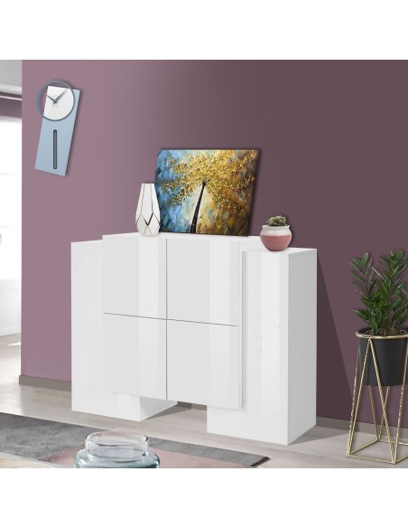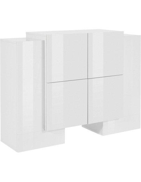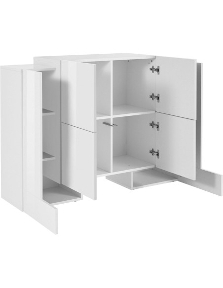 Kevin H2A/4A W è una credenza alta moderna dal design pulito ed elegante, ideale per arredare con stile la zona living, la cucina o la camera da letto. Realizzata in legno MDF di alta qualità, si presenta nella raffinata finitura bianco laccato lucido, capace di donare luminosità e leggerezza visiva a qualsiasi ambiente.