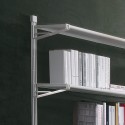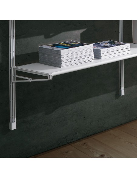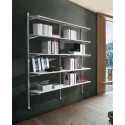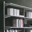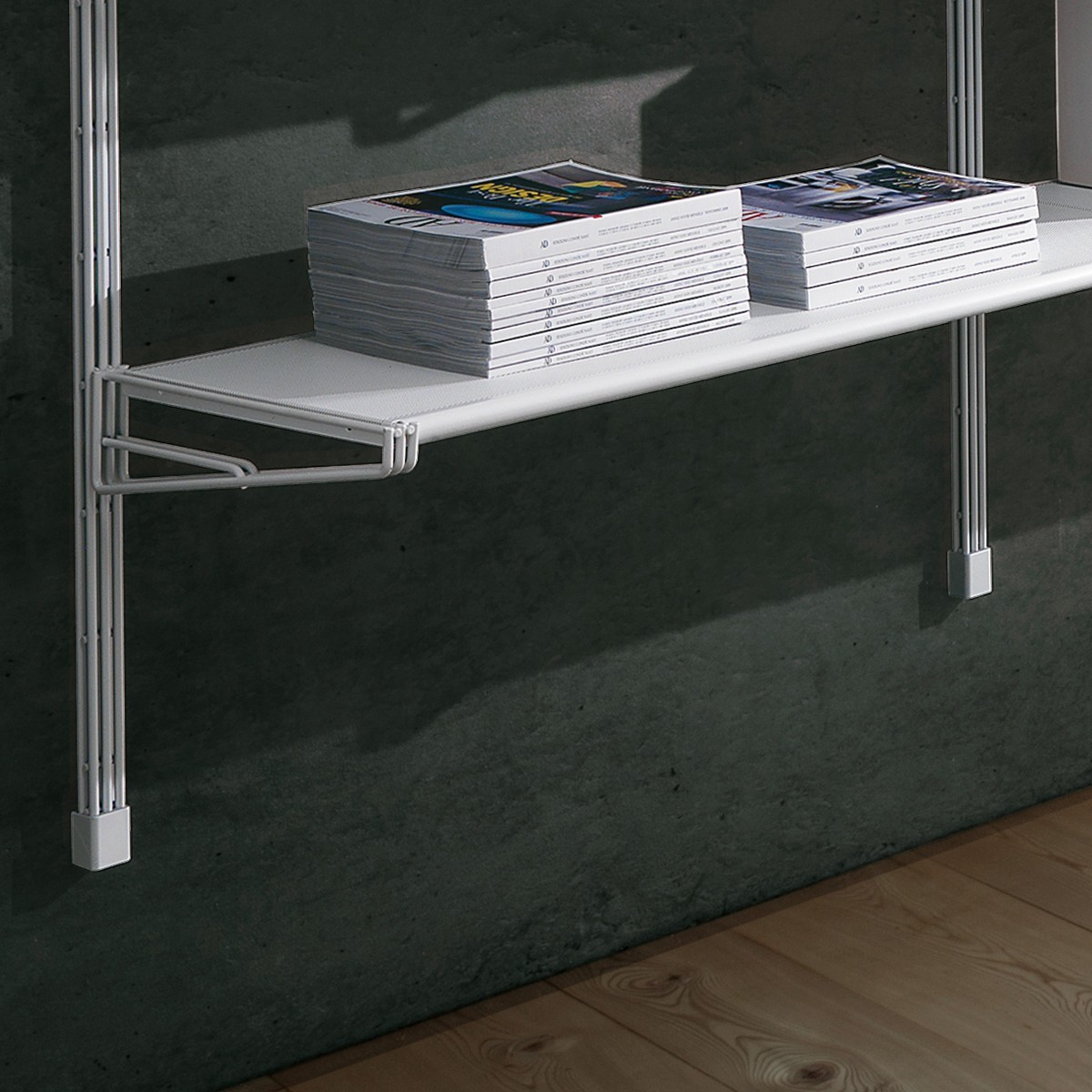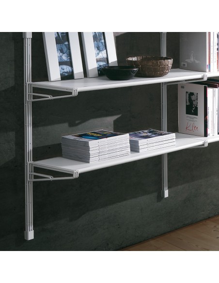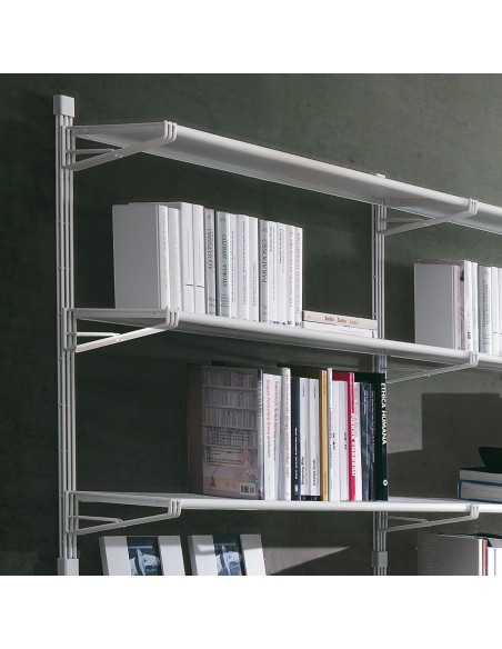 Montanti in tondini e giunti in acciaio verniciati con polveri epossidiche bianco opaco, coprigiunti in tecnopolimero. Assemblaggio: fissaggio del montante a parete tramite il giunto in acciaio. Montanti composti da sei tondini verticali Ø7 mm, allineati frontalmente, tre davanti e tre dietro, uniti tra loro da una fila centrale di tondini orizzontali Ø6 mm che permettono l’aggancio dei supporti per ripiani ogni 9,5 cm. I montanti si possono sovrapporre verticalmente, per realizzare librerie componibili a parete. Portata massima 50 Kg.
