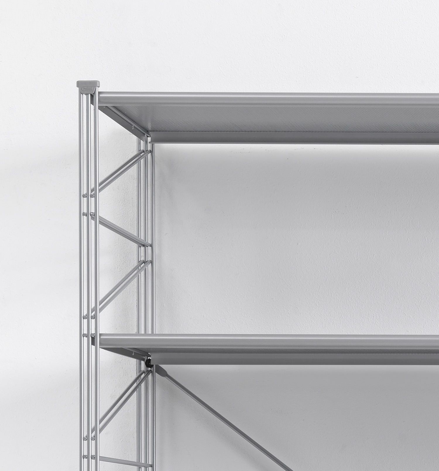 Ripiani in lamiera piena: lamiera di acciaio con piega di irrigidimento a doppio spessore sui bordi frontale e posteriore, verniciata con polveri epossidiche, bordi arrotondati, spessore 22,5 mm. Assemblaggio: diretto sui tondini orizzontali dei montanti.