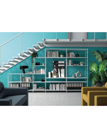 La struttura è costituita da montanti in tondini d’acciaio laccato, mentre i ripiani in lamiera d’acciaio piena offrono un appoggio stabile e sicuro per libri, riviste, oggetti decorativi o faldoni da ufficio. La verniciatura a polveri epossidiche, eseguita ad alta temperatura, assicura resistenza nel tempo contro graffi, urti e umidità, mantenendo la brillantezza delle superfici anche dopo anni di utilizzo.